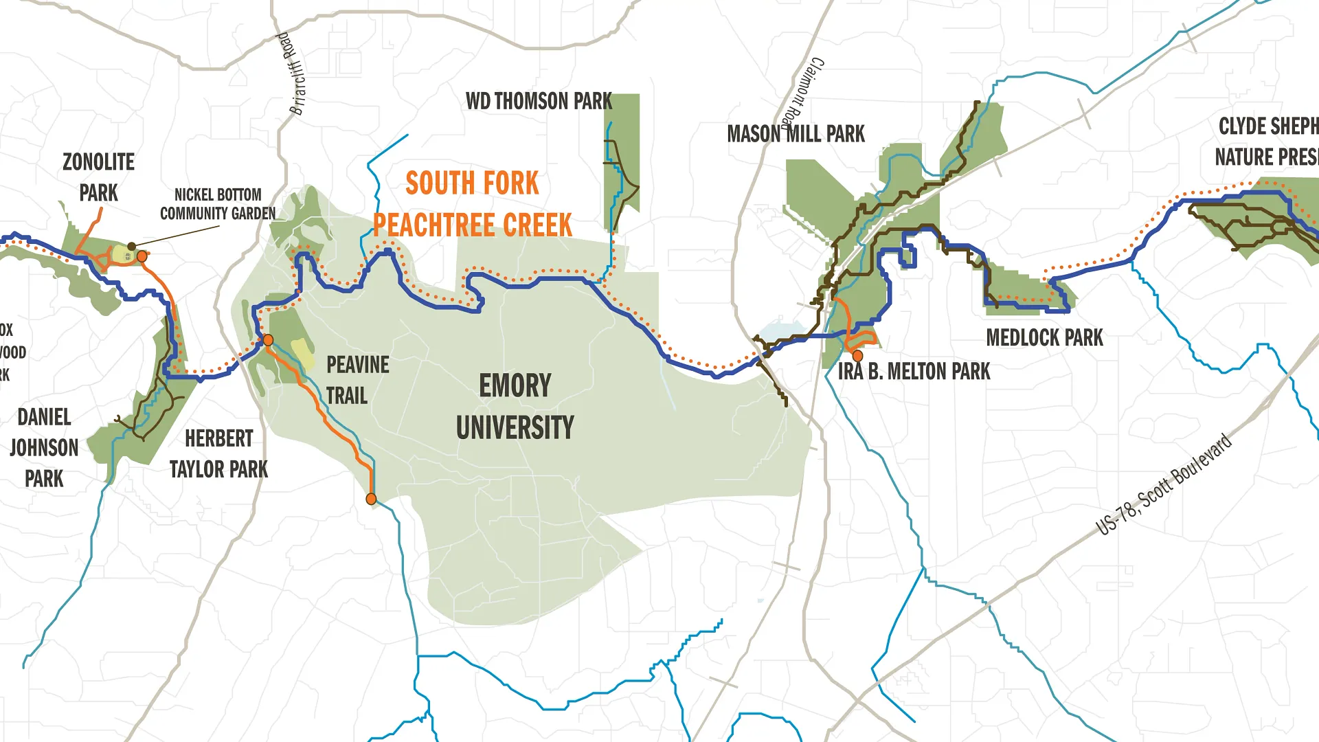 This map depicts where the South Fork of Peachtree Creek flows near Emory University and the surrounding neighborhoods. Provided by South Fork Conservancy.